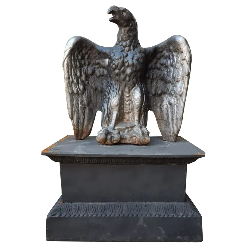 Escultura de águia com a cabeça para esquerda, feita em ferro fundido.